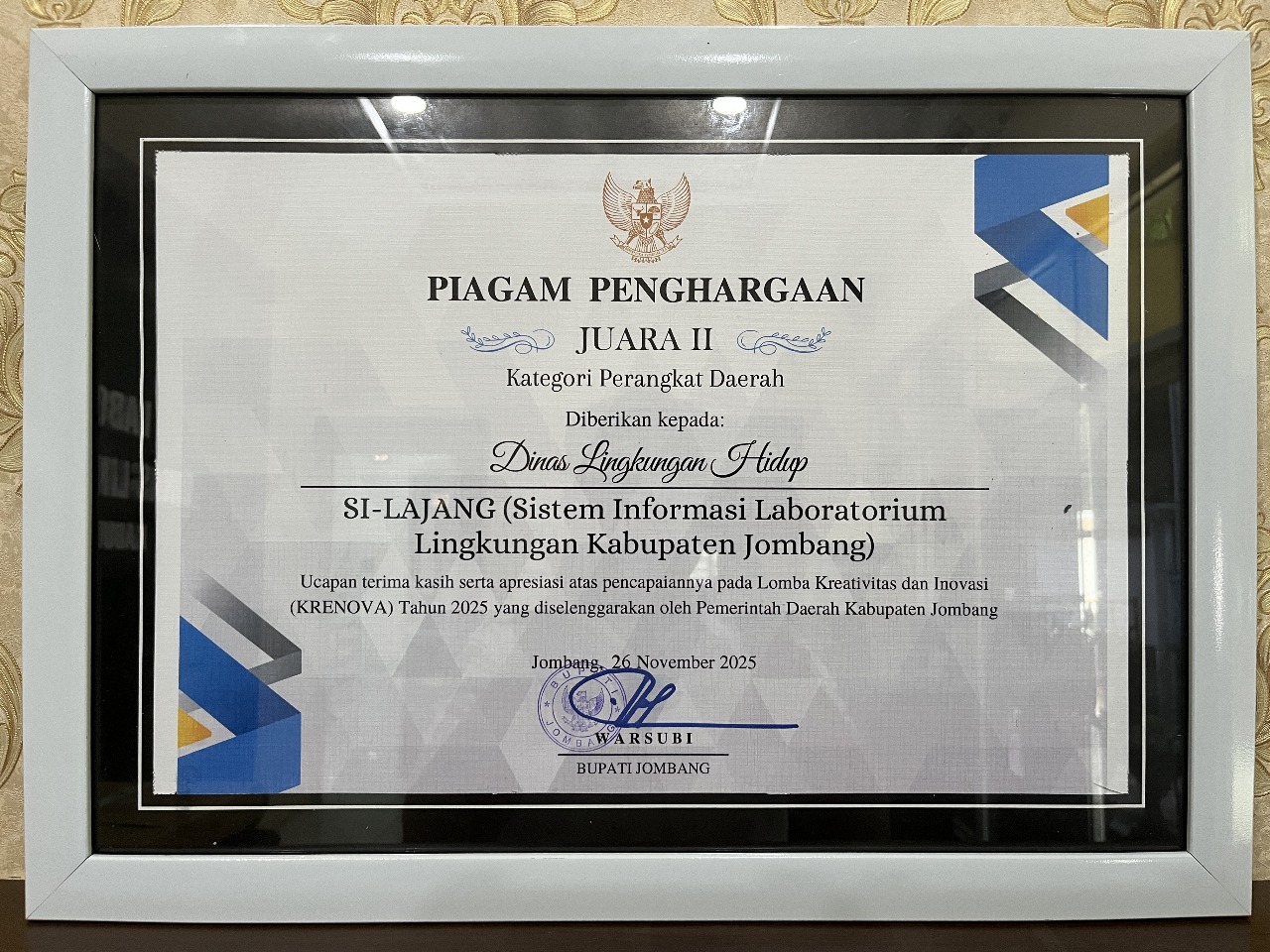 Selamat kepada UPTD Laboratorium Lingkungan Hidup atas diraihnya Juara 2 Lomba Kreativitas dan Inovasi (KRENOVA) Kabupaten Jombang Tahun 2025, untuk Inovasi Sistem Informasi Laboratorium Lingkungan Kabupaten Jombang (SILAJANG).